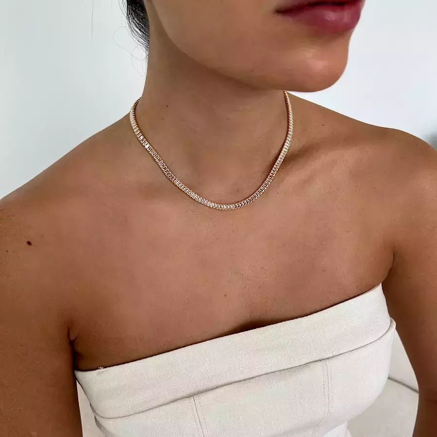 Ele é DESLUMBRANTE! Descubra o luxo e o estilo com nosso Colar Riviera Baguete ! Cuidadosamente elaborado, nosso colar riviera apresenta pedras que brilham intensamente. Com detalhes charmosos e um toque de glamour, ele transforma qualquer look básico em algo verdadeiramente espetacular. Adquira já o seu Colar Riviera e sinta a diferença que um toque de luxo pode fazer!